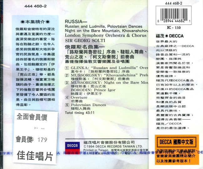 俄羅斯音樂特有的深沈與豪邁及寬廣的力度一直深受樂迷的喜愛。本集選錄四部著名的俄羅斯樂曲,包括鮑羅定的「伊果王子」、穆梭斯基的「荒山之夜」等,都是旋律流暢、極富東方格調的曲子。蕭提指揮之下的倫敦交響與合唱團更發揮了令人震懾的效果,曲目與詮釋可謂盲得益彰。