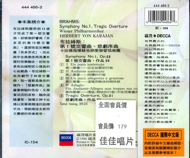 布拉姆斯:第1號交響曲、悲劇序曲(國際中文版104)