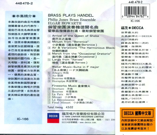 本集收錄的曲目均為韓德爾最著名的代表作,這些巴洛克名曲原由管弦樂器及大鍵琴演奏,如今由管樂團演奏,使原本華美精緻的音樂更加莊嚴輝煌。菲利浦.瓊斯銅管樂團是最頂尖的管樂團,銅管威力世界第一,優異的演奏品質,使該團的巡迴演出及錄音贏得無數國際讚譽。本集榮獲企鵝評鑑三星評價,自然是欣賞其精采表現的最佳選擇。