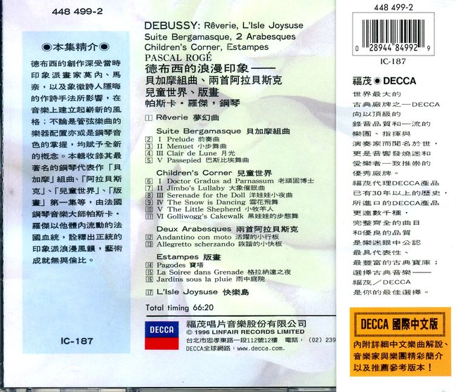 本輯收錄德布西最著名的鋼琴代表作「貝加摩」組曲、「阿拉貝斯克」、「兒童世界」、「版畫」第一集等,由法國鋼琴音樂大師帕斯卡.羅傑以他體內流動的法國血統,詮釋出正統的印象派浪漫風韻,藝術成就無與倫比。