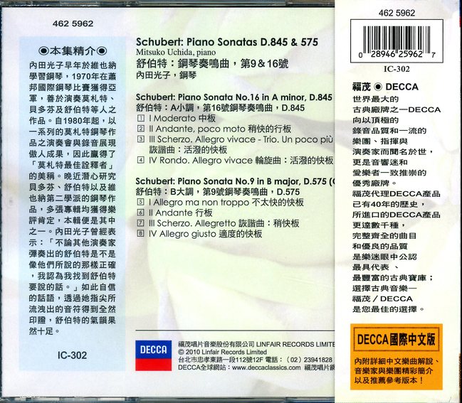 舒伯特:第9 & 16號,鋼琴奏鳴曲 / 內田光子,鋼琴(國際中文版302)