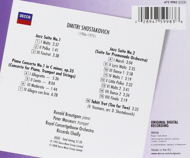 要瞭解蕭士塔高維契所謂的「爵士音樂」,就要從當時俄國人所理解的爵士一辭去探尋,在俄國人心目中的爵士,指的其實只是當代的美國流行音樂,也就是大約20年代的美國流行音樂,這包含的音樂類別很廣泛,從繁音飛絮曲到狐步舞等等,而不完全是我們現代所理解的爵士樂。在這張專輯中,夏伊則收納了3首蕭士塔高維契創作中和當時美國流行音樂有關的作品。其中兩首爵士組曲採用非常不同於蕭氏其他作品的配器,包括鐵琴、吉他、手風琴、口琴和薩克斯風。而作為這些組曲中各首舞曲的旋律,則是採用俄國民謠。其中在大導演庫伯利克邀請湯姆克魯斯和妻子妮可基曼合作的電影「大開眼戒」中,就引用了第二號爵士組曲中至為陰森的圓舞曲,而該片所用的演奏,正來自夏伊這份錄音。至於蕭氏最有名的輕音樂作品,則是「大溪地狐步舞」,此曲是由音樂劇作曲家Youmans名為「一杯茶賣兩便士」改成的。一開始是指揮家馬可和蕭氏打賭,看他能不能在1個小時內,把這首被俄國人視為難登大雅之堂的樂曲改編成管弦音樂,而蕭氏也果然在短短40分鐘裡贏了賭注,在他的改寫下,此曲成了他最知名的幻想曲。第一號鋼琴協奏曲有時也被稱為‘為小號與鋼琴的協奏曲’,這是因為此曲中小號扮演著和鋼琴一樣重要的獨奏份量,這首協奏曲中帶有強烈的爵士樂影響因此才會被收入在這裡,此曲也是蕭氏當初以鋼琴家身份參加華沙蕭邦鋼琴大賽的自作曲。在這份1993年錄音中擔任鋼琴獨奏的鋼琴家布勞帝岡,近年來全心投入古鋼琴演奏的領域,成為當代最活躍的古鋼琴家。這份錄音最早在1993年發行時,兩首爵士組曲在西方並不那麼廣為人知,但因為此片的暢銷,而讓片中這些音樂跟著成為各音樂廳中經常演奏的常見曲目。
