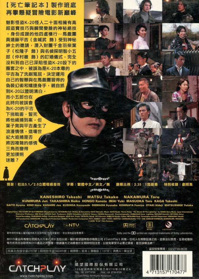 魅影怪盜K-20怪人二十面相擁有高超盜寶技巧與瞬間變臉的神秘絕技,身份成謎的他四處橫行…馬戲團員遠藤平吉(金城武 飾)受到神秘紳士的邀請,潛入財團千金羽柴葉子(松隆子 飾)與名偵探明智小五郎(仲村徹