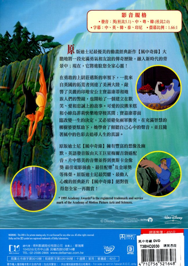 原版迪士尼『風中奇緣』擁有豐富的想像及幽默,英語發音版由天王巨星梅爾吉勃遜配音,片中悠美的音樂並得到奧斯卡金像獎最佳電影插曲、最佳配樂及金球獎等殊榮。原版迪士尼最閃耀、最動人心魄的經典鉅片『風中奇緣』絕對值得您全家人一再觀賞!