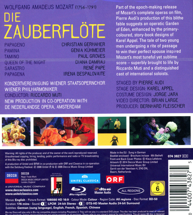 本片為Pierre Audi製作,慕提指揮的全新演出錄影,展現了莫札特充滿想像的奇幻音符與曼妙旋律。德國頂尖男低音René Pape領銜主演祭司薩拉斯妥,花腔女高音Diana Damrau以火花般的演唱成功演活了夜后的角色。用色大膽的燈光與佈景,以及特別設計的服裝與造型,在在令人耳目一新,無疑是21世紀歌劇影片製作之里程碑。紐約時報(New Your Times)便認為這是一份「大獲全勝的演唱陣容……驚人的演出」。