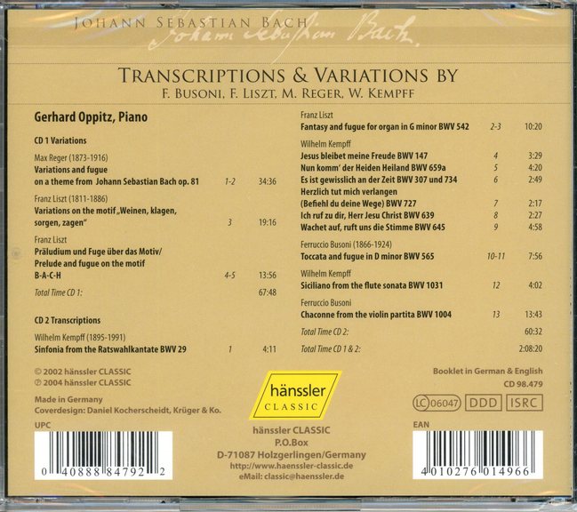 TRANSCRIPTIONS & VARIATIONS BY F. BUSONI, F. LISZT, M. REGER, W. KEMPFF/GERHARD OPPITZ
