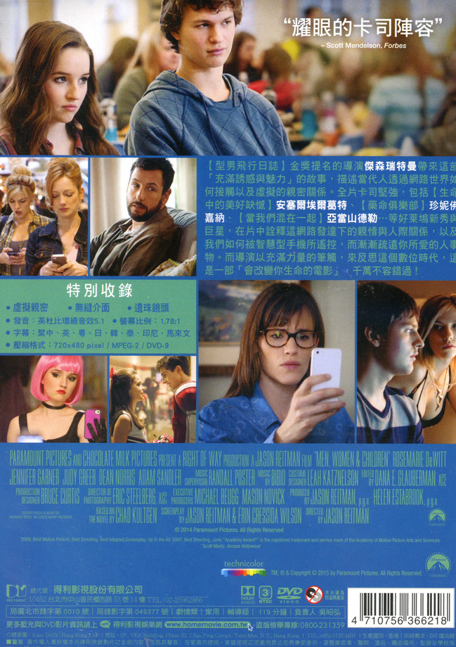 【型男飛行日誌】金獎提名的導演傑森瑞特曼帶來這部「充滿誘惑與魅力」的故事,描述當代人透過網路世界如何接觸以及虛擬的親密關係。全片卡司堅強,包括【生命中的美好缺憾】安塞爾埃爾葛特、【藥命俱樂部】珍妮佛嘉納、【當我們混在一起】亞當山德勒…等好萊塢新秀與巨星,在片中詮釋這網路發達下的親情與人際關係,以及我們如何被智慧型手機所遙控,而漸漸疏遠你所愛的人事物。而導演以充滿力量的筆觸,來反思這個數位時代,這是一部「會改變你生命的電影」,千萬不容錯過!