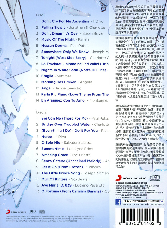 專輯收集Sony唱片公司旗下最優質的跨界歌手與古典聲樂家所演唱的27首既通俗且經典的名曲。選曲範圍涵蓋經典的歌劇選曲、古典震撼名曲、悅耳的流行金曲、著名賣座電影配樂、音樂劇浪漫經典、跨越時空的永恆名曲與義大利拿波里民謠等。豐富多樣的內容,全面滿足樂迷渴求的浪漫情懷。