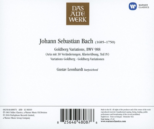 雖然荷蘭大鍵琴演奏家雷翁哈特是在1960年代錄下這一張《郭德堡變奏曲》,但是音質與樂器的定位感相當清晰,而雷翁哈特嚴謹而且條理分明的詮釋,也是這個版本能夠歷久不衰的主因。