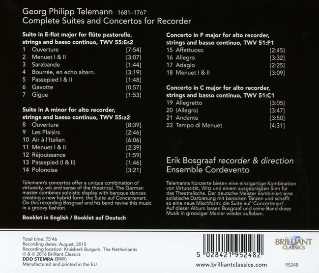 | 4. | Concerto TWV 51:C1 in C major for recorder, strings & b.c. Composer:TELEMANN, GEORG PHILIPP |
