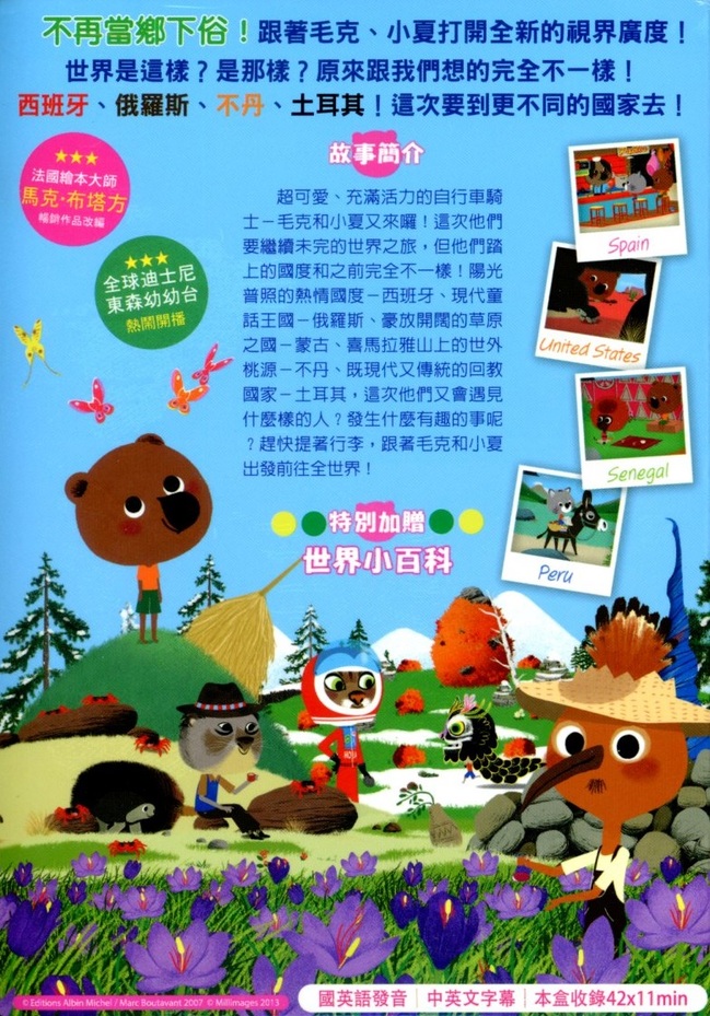 【環遊世界探險趣63-104】是由法國動畫公司Millimages製作,第1-62集已於多個國家發行,並受到廣大的迴響,於是後續的故事應運而生。本作品為法國人氣繪本大師-馬克‧布塔方作品-《跟莫克一起環遊世界》的延伸,透過毛克和小夏讓大家看見在世界各個角落的人、景色和文化習慣。