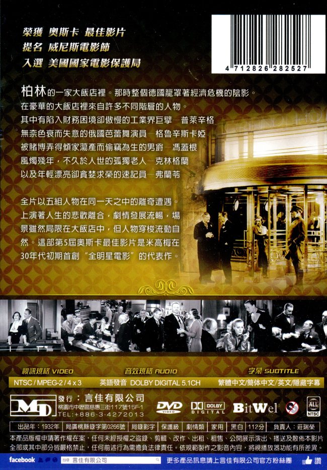 全片以五組人物在同一天之中的離奇遭遇。上演著人生的悲歡離合,劇情發展流暢,場景雖然局限在大飯店中,但人物穿梭流動自然。這部第5屆奧斯卡最佳影片是米高梅在30年代初期首創“全明星電影”的代表作。