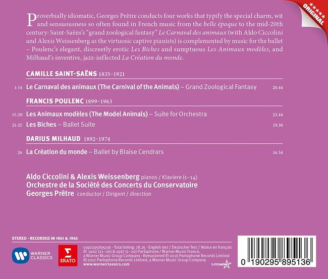 除了歌劇之外,法國管弦樂作品也是普赫特的強項。收錄在這張錄音裡的作品,可以很清楚地發現普赫特長達將近一個世紀的音樂軌跡。這四首作品都是相當典型的法國音樂,散發著獨特的機智、幽默與魅力。聖桑的《動物狂歡節》,除了一首唯美動人的「天鵝」之外,幾乎每一首都在嘲諷作曲家眼中的古典樂壇怪現況。米堯的《世界的創造》,可以聽到鮮明的爵士樂影子。至於說浦朗克《動物的典型》則和《動物狂歡節》大異其趣,豐美的音樂語法,也是最能夠展現法式管弦樂華麗色彩的作品。