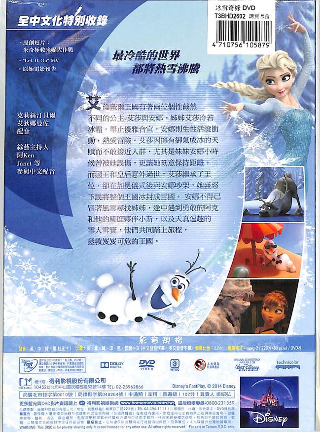 迪士尼繼《魔髮奇緣》與《無敵破壞王》之後,再度推出口碑動畫鉅作《冰雪奇緣》,由克莉絲汀貝爾、艾狄娜曼佐配音英文版,中文版則由綜藝主持人阿Ken 、Janet 等參與配音。