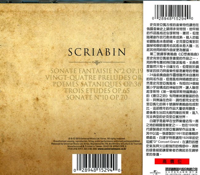 白建宇是最早在世界樂壇佔有一席之地的韓國音樂家之一,他在1990年代錄製過史克里亞賓鋼琴作品全集,其中以這一張錄製於1991年的專輯評價最高。白建宇特意選用1926年的史坦威''D'' Concert Grand,在濃烈的歷史氣氛與火山般強烈的情感中,清晰的錄音細節讓愛樂者彷彿就坐在鋼琴家的身邊。