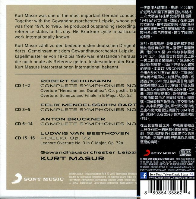 當然,提起馬舒,愛樂者們都不會錯過他最經典的布商大廈管弦樂團時期,他於1970至1997年執掌該團近28年之久,與這個古典音樂史上數一數二的最老樂團進行了超過900場巡迴音樂會,也留下許多令人難忘的紀錄。本集以16張CD收錄這個黃金組合於1972至1981年間、二戰後的新布商大廈落成之前進行的錄音,包括曾於1835年出任該樂團首席指揮的孟德爾頌之五首交響曲;舒曼交響曲全集及《赫曼與多麗亞》序曲、《序曲、詼諧曲與終曲》;舒曼的第一號交響曲即是由孟德爾頌指揮此團首演。同步收錄布魯克納九首交響曲全集,其中最受歡迎的第七號交響曲也是由布商大廈管弦樂團於1884年首演,成為布氏在世時少數大獲成功的作品。