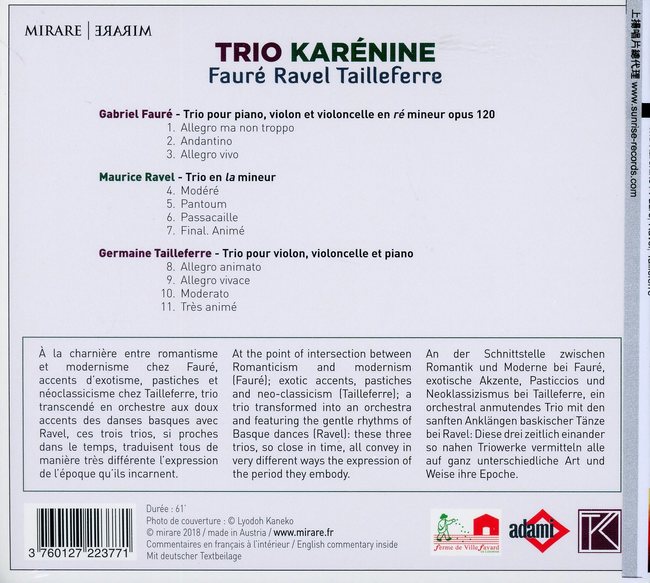 At the point of intersection between Romanticism and modernism (FaurE); exotic accents, pastiches and neo-classicism (Tailleferre); a trio transformed into an orchestra and featuring the gentle rhythms of Basque dances (Ravel): these three trios, so close in time, all convey in very different ways the expression of the period they embody.