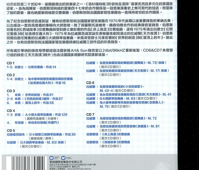 為了紀念伯恩斯坦百歲冥誕,擁有伯恩斯坦與法國國家管弦樂團在1970年代後期以後重要錄音的華納音樂,以出版這一套別具意義的專輯向大師致敬。除了與羅斯托波維奇、魏森伯格合作的經典錄音室錄音,伯恩斯坦著名的《西城故事》交響舞曲與受到爵士樂影響的作品《岸上風雲》交響組曲,還有1979年演出白遼士《幻想交響曲》與《哈洛德在義大利》,1975年為拉威爾百歲冥誕在香榭麗舍劇院演出的拉威爾《天方夜譚》,伯恩斯坦親自擔任獨奏的拉威爾G大調鋼琴協奏曲,米堯深受爵士元素影響的《世界的創造》與《屋頂上的牛》。除此之外,也有伯恩斯坦與法國國家管弦樂團排練拉威爾三部作品的珍貴錄音。