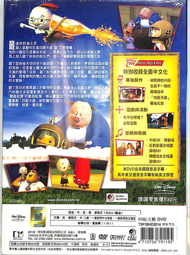 爆笑的故事、讓人忍不住"聞雞起舞"的動感配樂、精采豐富的DVD特別收錄內容,迪士尼動畫喜劇「四眼天雞」絕對讓您全家大小樂開懷,想要一看再看!