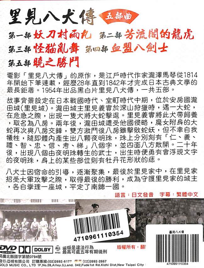 電影「里見八犬傳」的原著,是江戶時代作家瀧澤馬琴從1814年開始下筆連載,經歷28年直到1842年才完成日本古典文學的最長鉅著。1954年出品黑白片里見八犬傳,一共5部。