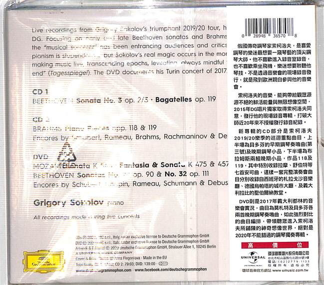 DVD則是2017年義大利都林的音樂會實況,曲目為莫札特及貝多芬各兩首晚期鋼琴奏鳴曲,如此強烈對比的曲目編排,帶領聽眾進入索柯洛夫所鋪陳的神奇想像世界,絕對是2020年不能錯過的鋼琴獨奏專輯。