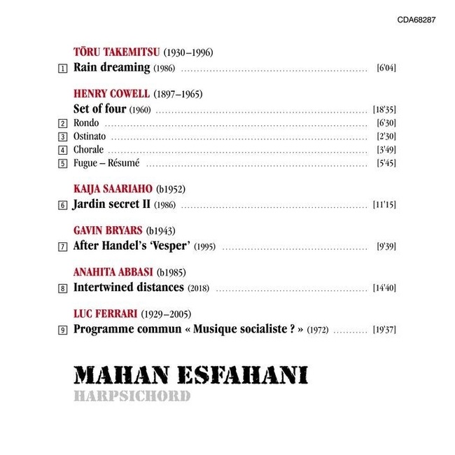 Under Mahan Esfahani's hands—and occasionally fists—the harpsichord is transmogrified into an elemental force, by turns supported or menaced by an astonishing arsenal of electronics. Concerned listeners please note: no harpsichords were harmed in the making of this album.