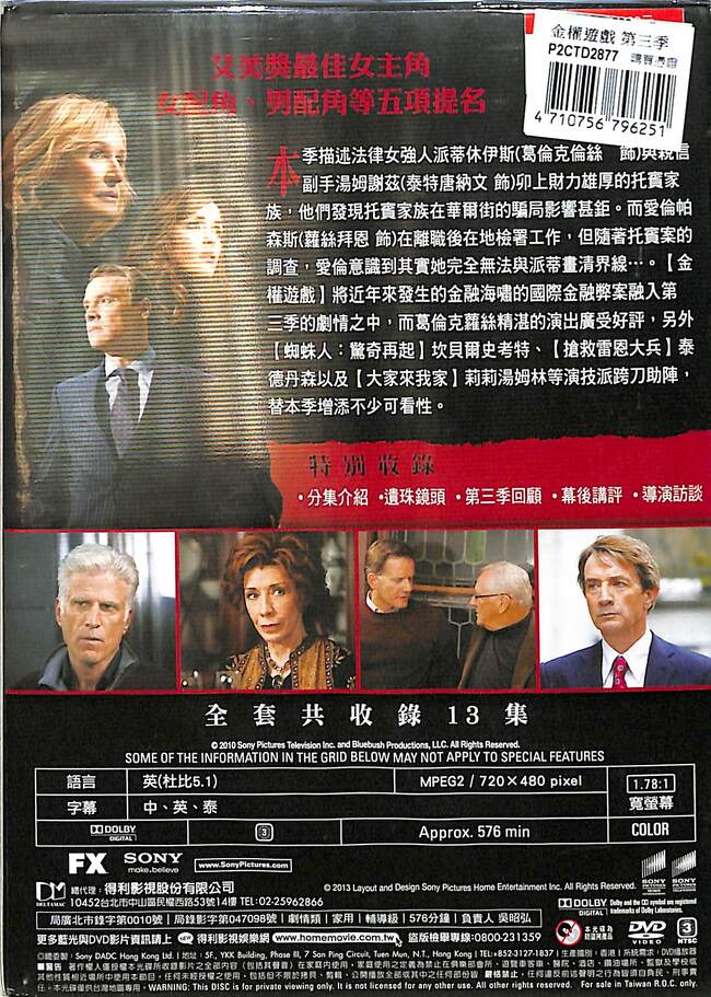 飾)在離職後在地檢署工作,但隨著托賓案的調查,愛倫意識到其實她完全無法與派蒂畫清界線…。【金權遊戲】將近年來發生的金融海嘯的國際金融弊案融入第三季的劇情之中,而葛倫克蘿絲精湛的演出廣受好評,另外【蜘蛛人:驚奇再起】坎貝爾史考特、【搶救雷恩大兵】泰德丹森以及【大家來我家】莉莉湯姆林等演技派跨刀助陣,替本季增添不少可看性。