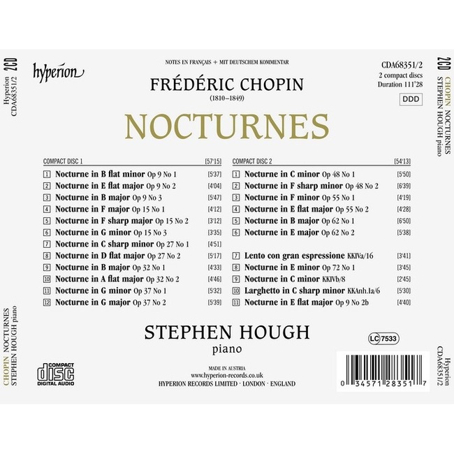 ‘Some of the finest operatic arias ever written’ is Stephen Hough’s brilliant characterization of the Nocturnes, one which holds the key to his intensely lyrical interpretations of these most perfect of bel canto masterworks.