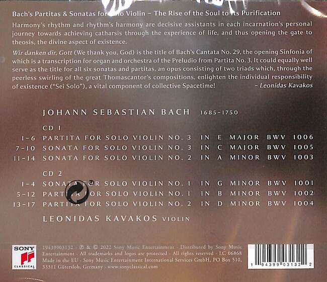 這張收錄巴哈完整的小提琴獨奏「奏鳴曲」與「組曲」(Partita)的專輯,是小提琴家卡瓦柯斯(Leonidas Kavakos)自2018年成為Sony唱片公司的專屬音樂家以來,最重要的錄音發行。作品中包含了第二號組曲中著名的d小調夏康舞曲(Chaconne)。如同當時許多與他同時代人,巴哈利用合唱團、管弦樂隊和獨奏家的演奏陣容,創造出色的聲音結構。 然而,其獨特之處在於他能夠用樂器喚起類似建築結構的奇蹟。 巴哈將作品命名為 Sei Solo——既是對作品本身的描述(「六首獨奏曲」),也是對演奏者所面臨挑戰的提醒:「你是孤獨的」。