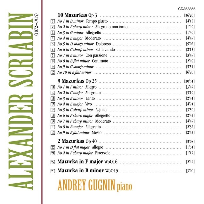 Scriabin clearly responded to the passionate and emotionally charged nature of the mazurka, qualities shared by all twenty-three of the exquisite miniatures recorded here.