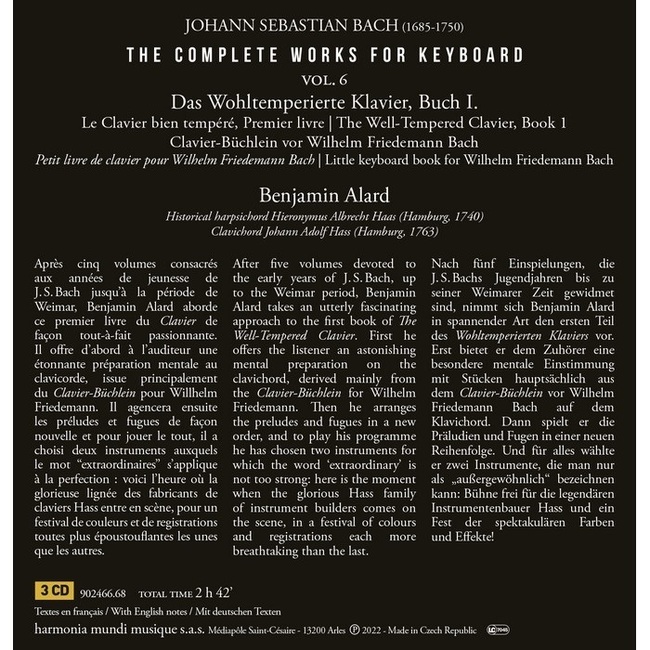 After five volumes devoted to the early years of J. S. Bach, up to the Weimar period, Benjamin Alard takes an utterly fascinating approach to the first book of The Well-Tempered Clavier. First he offers the listener an astonishing mental preparation on the clavichord, derived mainly from the Clavier-Buchlein for Wilhelm Friedemann. Then he arranges the preludes and fugues in a new order, and to play his programme he has chosen two instruments for which the word 'extraordinary' is not too strong: here is the moment when the glorious Hass family of instrument builders comes on the scene, in a festival of colours and registrations each more breathtaking than the last.