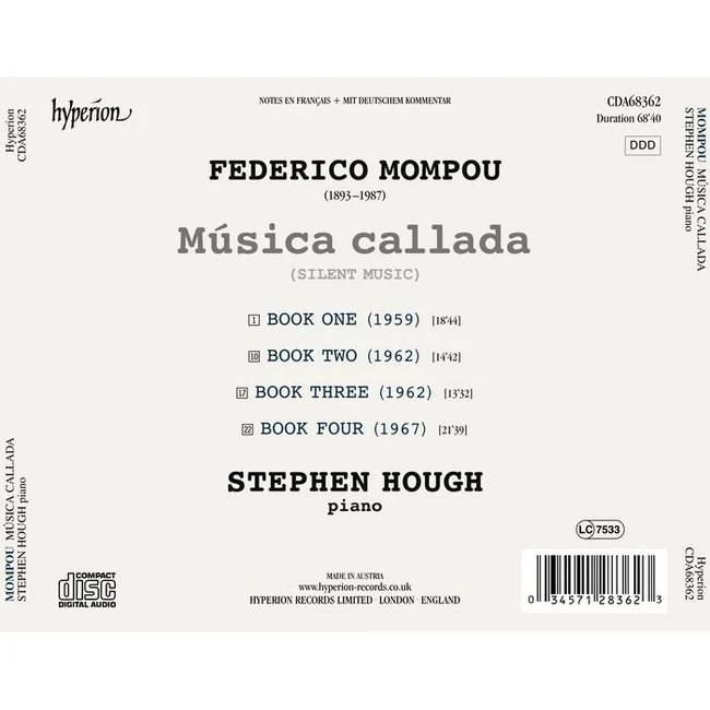 The Penguin Guide to Compact Discs awarded a rosette to Stephen Hough’s earlier Gramophone Award-winning Hyperion recording of Mompou, and this successor is equally fine. Musica callada comprises twenty-eight exquisite miniatures, brief in duration yet rich in allusion: music which makes its mark with subtlety, understatement and a unique economy of means.