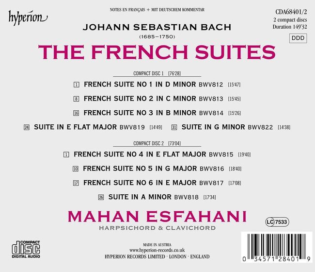 大鍵琴家曼漢˙伊斯法哈尼長期致力於巴哈鍵盤作品的完整錄製,這次推出的《法國組曲》專輯,再次展現他獨特的視野與細膩手法。這套錄音不僅收錄巴哈最為親密、富含生活氣息的六首《法國組曲》,還加入三首風格特殊的補遺組曲(BWV 818、819、822),讓樂迷得以窺見更廣闊的作品面貌。
