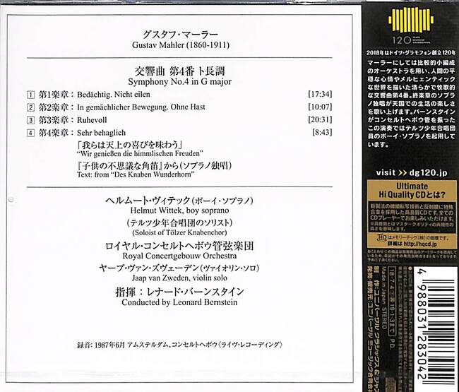 マーラーにしては比較的小編成のオーケストラを用い、人間の平穏な心情やメルヒェンティックな世界を描いた清らかで牧歌的な交響曲第4番。終楽章のソプラノ独唱が天国での生活の楽しさを歌い上げます。バーンスタインがコンセルトヘボウ管を振ったこの演奏ではテルツ少年合唱団員のボーイ・ソプラノを起用しています。