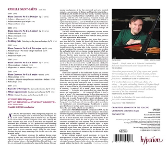 When first issued in 2001, this set from Stephen Hough and the CBSO promptly garnered for these artists a second Gramophone Recording of the Year Award, for these are performances which combine all the elegance required for the Frenchman's music with the utmost bravura. Saint-Saens himself was a formidable pianist and his rare 1904 (!) 78-rpm recording of Africa has until now been matchless; finally in Stephen Hough's performance he has a rival.