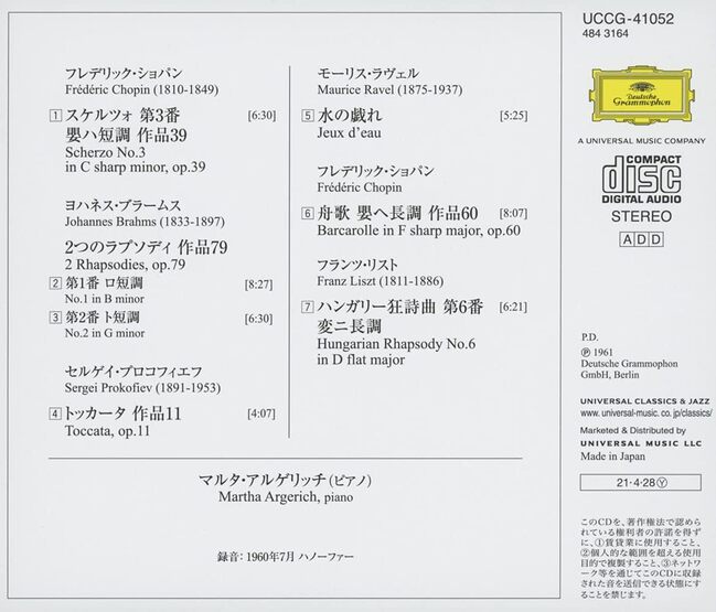 這是阿格麗希在1957年贏得日內瓦和布梭尼國際鋼琴比賽冠軍後,為德意志留聲機公司錄製的首張唱片。她完美的技巧和音樂性給人留下了深刻的印象。這張唱片記錄了她年輕時的成熟,至今仍是技藝精湛的標竿。