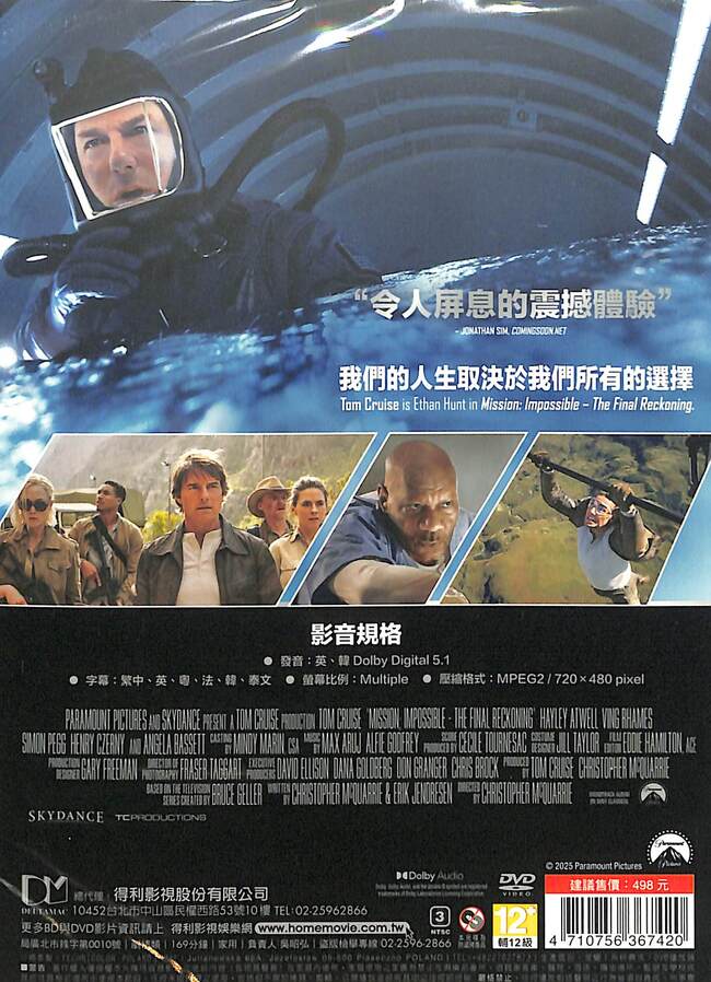 搏命挑戰極限、最盛大演出的任務 背面 令人屏息的震撼體驗 我們的人生取決於我們所有的選擇 導 演:克里斯多弗麥奎里 演 員:【不可能的任務】系列 湯姆克魯斯、【不可能的任務】系列 海莉艾特沃 電影片長:約 169 分鐘 螢幕比例:Multiple 發音:英 、韓 Dolby Digital 5.1 字幕:繁中、英、粵、法、韓、泰文