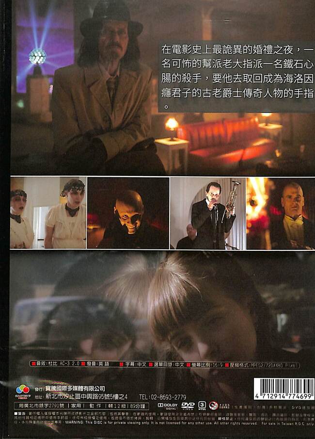 在電影史上最詭異的婚禮之夜,一名可怖的幫派老大指派一名鐵石心腸的殺手,要他去取回成為海洛因癮君子的古老爵士傳奇人物的手指。 導演:布魯斯麥當勞 主要演員: 史帝芬麥克哈帝 亨利洛林斯 茱麗葉路易斯 發音:英語 字幕:繁體中文 螢幕:16:9寬螢幕 音效:杜比5.1/ 2.0立體環繞音效 片長:約89分鐘