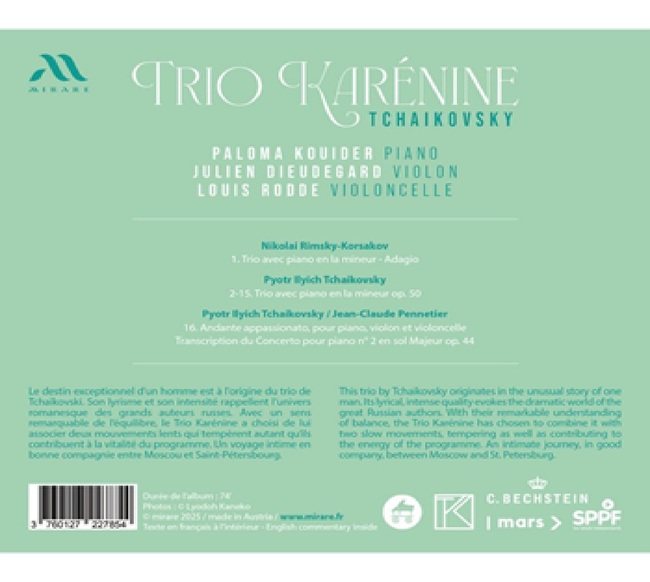 This trio by Tchaikovsky originates in the unusual story of one man. Its lyrical, intense quality evokes the dramatic world of the great Russian authors. With their remarkable understanding of balance, the Trio Karenine has chosen to combine it with two slow movements, tempering as well as contributing to the energy of the programme. An intimate journey, in good company, between Moscow and St. Petersburg.