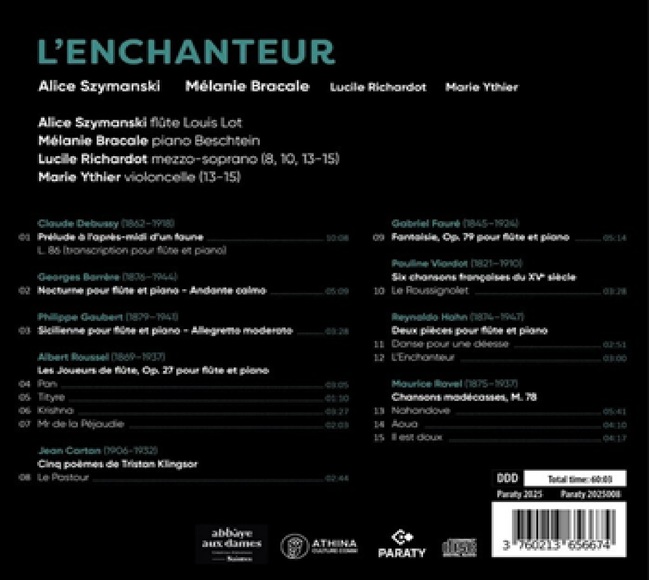 L'Enchanteur is a vibrant celebration of breath, tone, and musical heritage. Led by flutist Alice Szymanski, this sonic journey brings new life to the rare Lot flute of Gaston Blanquart — an overlooked 1867 gem — in dialogue with a 1900 Bechstein piano, a recent winner of the Victoires de la Musique Classique (Lucile Richardot), and a renowned virtuoso and chamber musician (Marie Ythier). Centered around the elegance of French repertoire and early impressionist colors, works by Faure, Roussel, Debussy, and Ravel are interwoven with moving, previously unpublished pieces. At the crossroads of eras, L'Enchanteur becomes a manifesto of transmission and emotion — the intimate quest of a flutist who listens, shares, and brings stories to life.