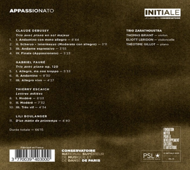 The Paris Conservatoire is the starting point of our adventure. Founded in 1795, the institution's ambition was to bring composers and performers together in one place, with the aim of promoting French music. Four of its representatives are featured on this recording: Gabriel Faure and Claude Debussy, setting the pace for French melodie and impressionist music; Lili Boulanger, piano prodigy, composer and the first woman to win the Prix de Rome for composition (1913), and Thierry Escaich, contemporary composer, organist, improviser and teacher, winner of four 'Composer of the Year' awards at the Victoires de la musique classique. From student to teacher, the four composers maintained close links with the Paris Conservatoire, marking the institution's history. Gabriel Faure was its director from 1905 to 1920, during which time he undertook a radical restructuring of the teaching programme. Claude Debussy also studied there, before joining the Conservatoire's Conseil superieur de l'enseignement, then still under Faure's direction. In 1909, after piano lessons with Paul Vidal, Lili Boulanger was admitted to the Conservatoire, where she studied for three years in Vidal's composition class. Following in the footsteps of his predecessors, Thierry Escaich also has close links with the institution: first as a pupil, then as a teacher of music theory, composition and organ improvisation since 1992.