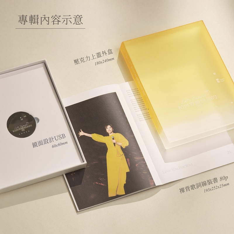為契合影音內容的頂規收藏價值,實體專輯特別使用壓克力精裝盒呈現業界首屈一指的超絕份量,寫真冊則以感光油墨表達Tanya蔡健雅此巡主旨,歷經黑暗後,終將向光前行;值得一提的是,USB的設計特地為Tanya蔡健雅開模打造,以世界像是一面鏡子為理念,衍生出雙面鏡的專屬USB造型,也讓專輯每一個細節都能感受到Tanya蔡健雅對於首張影音產品的重視與誠意。