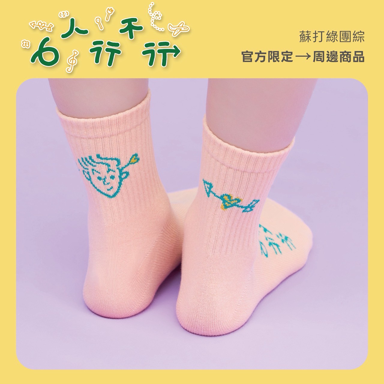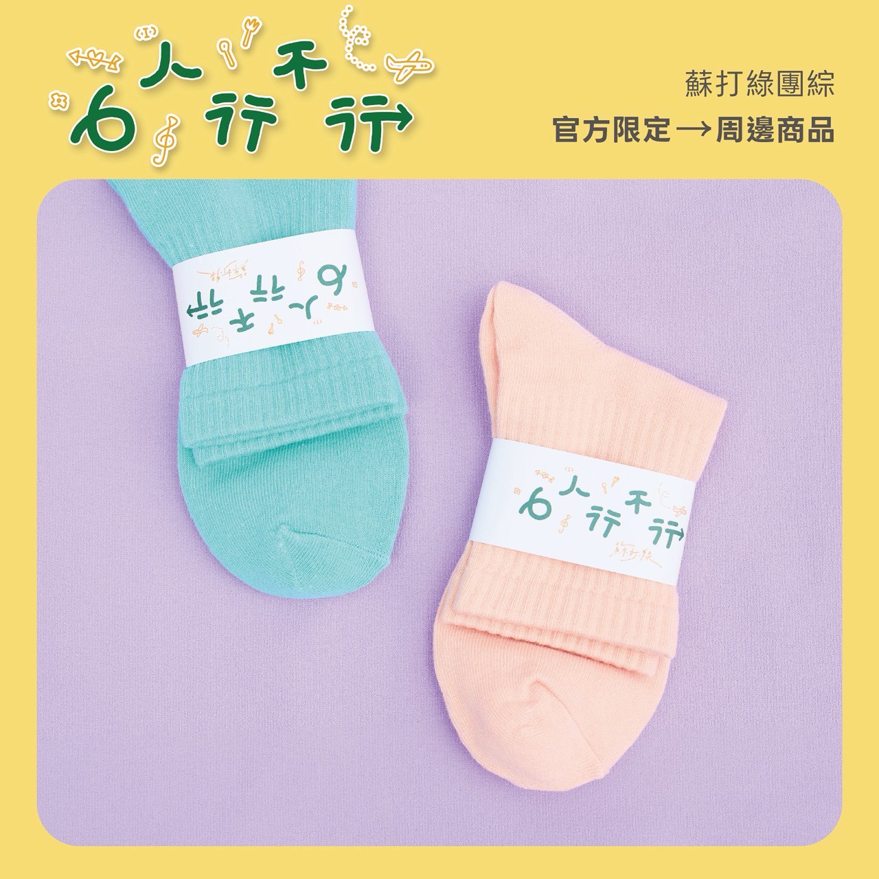 以《6人行不行》團綜的歡樂精神為核心,這款幸運襪不僅是日常穿搭的亮點,更是你的專屬應援團。襪身巧妙融合了趣味插畫與蘇打綠標誌,無論是低調的清新綠還是溫暖粉橘色,都讓大家能夠「幸福隨行」。