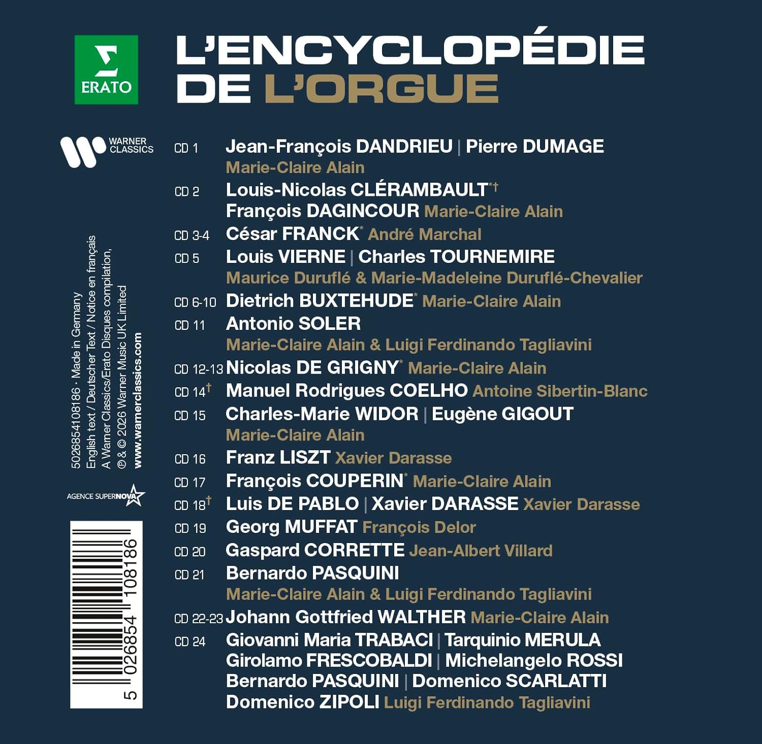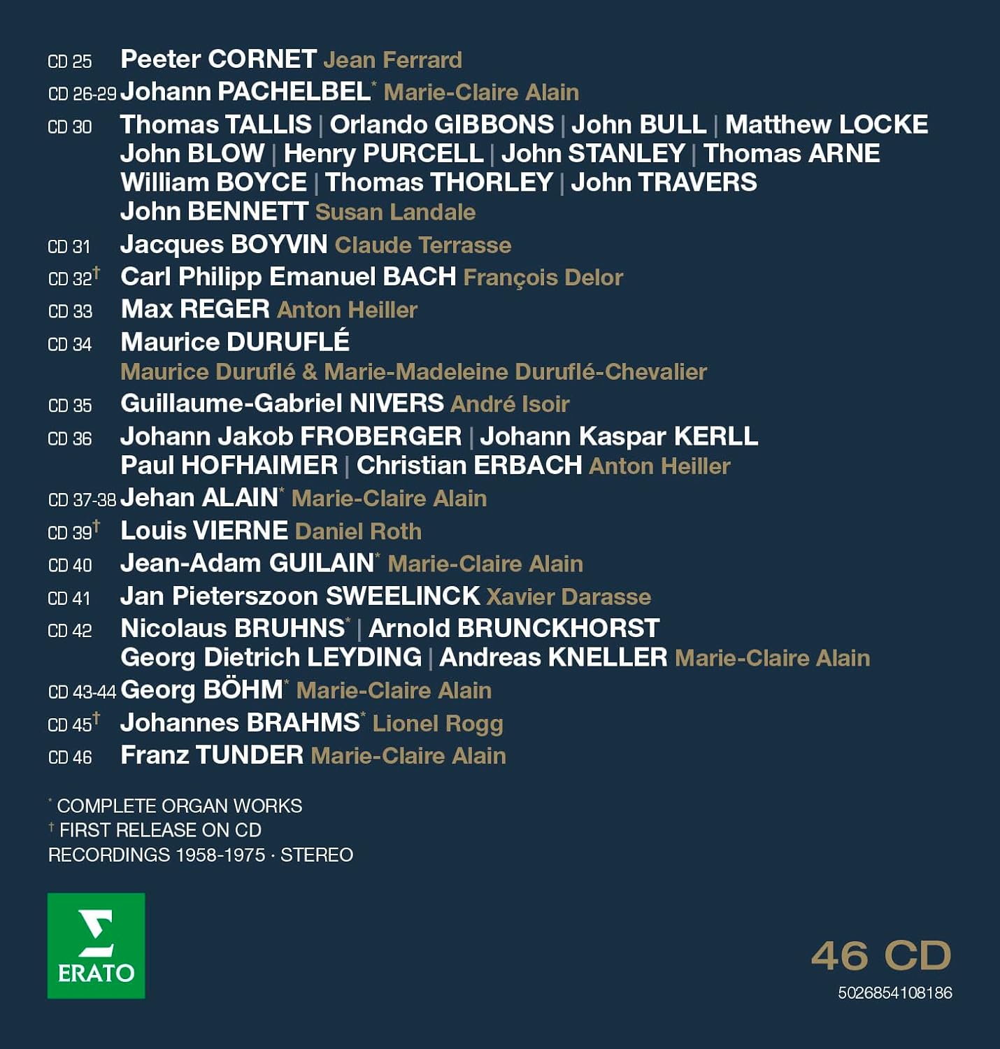 由富有遠見的音樂學者與管風琴家奧利維爾‧阿蘭——亦是瑪麗-克萊爾·阿蘭之兄——所倡議的宏大系列《管風琴小百科─Erato著名管風琴經典錄音全集》,呈現出一幅無與倫比的管風琴曲目全景圖。此系列橫跨多個地域、歷史時期(自16世紀至當代)與不同風格流派,提供深入而細緻的探索。