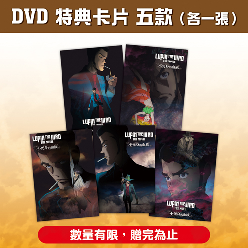 凡購買 魯邦三世 不死身的血族 DVD 贈送 特典卡片 五款(各一張),數量有限,送完為止。 映象特典:劇場預告 VIDEO:16:9 本篇:約93分 中文字幕(可關閉) 音源:Dolby Digital 5.1ch
