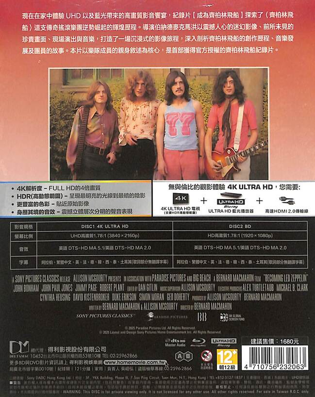 現在在家中體驗UHD以及藍光帶來的高畫質影音饗宴,紀錄片【成為齊柏林飛船】探索了〈齊柏林飛船〉這支傳奇搖滾樂團逆勢崛起的輝煌歷程。導演伯納德麥克馬洪以震撼人心的迷幻影像、前所未見的珍貴畫面、現場演出與音樂,打造了一場沉浸式的影像旅程,深入剖析齊柏林飛船的創作歷程、音樂發展及團員的故事。本片以樂隊成員的親身敘述為核心,是首部獲得官方授權的齊柏林飛船紀錄片。