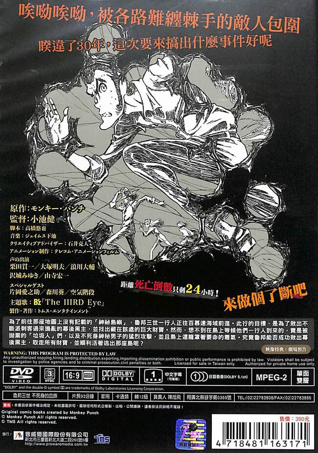 凡購買 魯邦三世 不死身的血族 DVD 贈送 特典卡片 五款(各一張),數量有限,送完為止。 映象特典:劇場預告 VIDEO:16:9 本篇:約93分 中文字幕(可關閉) 音源:Dolby Digital 5.1ch