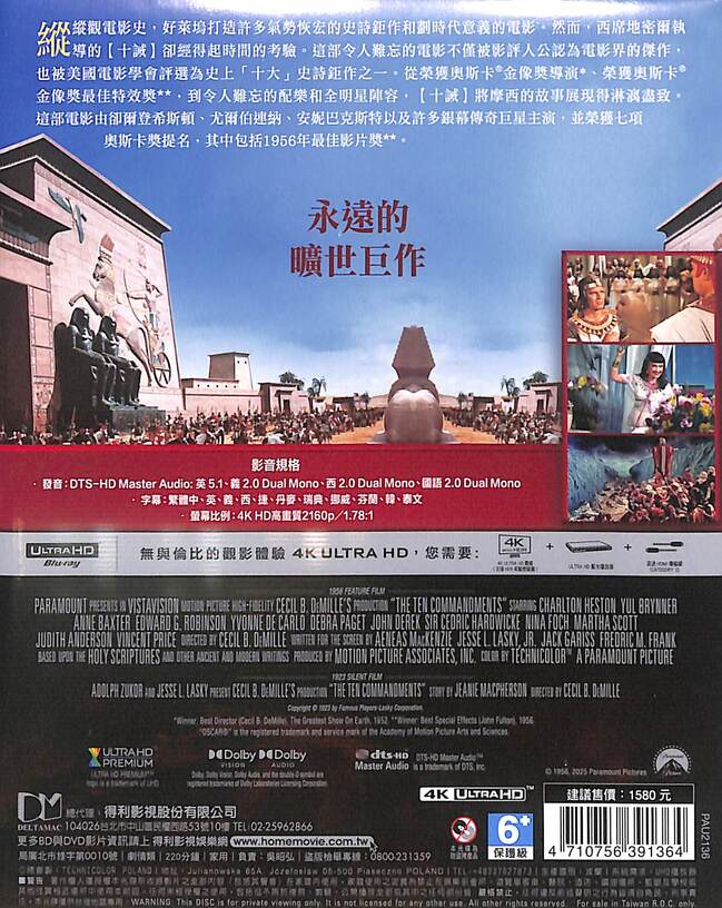 縱觀電影史,好萊塢打造許多氣勢恢宏的史詩鉅作和劃時代意義的電影。然而,西席地密爾執導的【十誡】卻經得起時間的考驗。這部令人難忘的電影不僅被影評人公認為電影界的傑作,也被美國電影學會評選為史上「十大」史詩鉅作之一。從榮獲奧斯卡®金像獎導演*、榮獲奧斯卡®金像獎最佳特效獎**,到令人難忘的配樂和全明星陣容,【十誡】將摩西的故事展現得淋漓盡致。這部電影由卻爾登希斯頓、尤爾伯連納、安妮巴克斯特以及許多銀幕傳奇巨星主演,並榮獲七項奧斯卡獎提名,其中包括1956年最佳影片獎***。