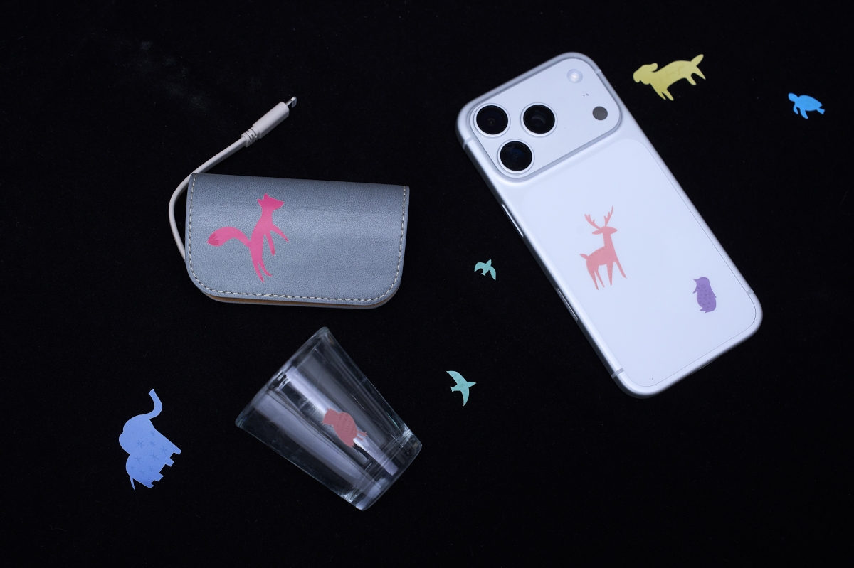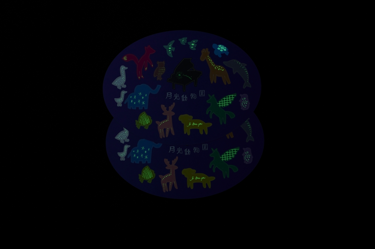 這款「月光動物園」貼紙,以優雅的鋼琴為中心,集結了長頸鹿、獨角獸與溫柔的大象等動物們,獨特的飽和藍底色,搭配細膩的動物剪影,在黑暗中散發出療癒的柔光。